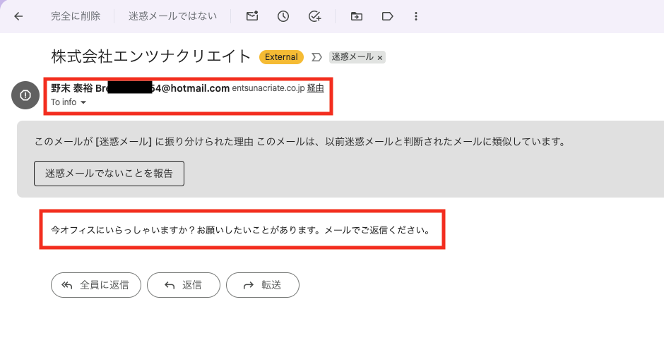 - 外部の第三者が 表示名を「社長名」に設定し、Hotmailなどのフリーメールから送信